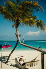 Beautiful young lady in dress sleeping in a hammock and holding hat. Tourist woman enjoys a tropical beach at Bali Indonesia. Blue sky and sunny day at Maldives beach resort. Travel after Covid-19