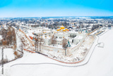 Aerial drone view of the Orthodox Holy Trinity Ipatievsky monastery during winter in Kostroma, Russia. Ancient touristic city of the Golden Ring.