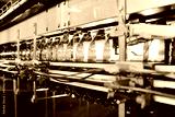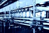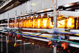 Industrial production of plastic bottles for low-alcohol beverages, soda and sunflower oil. Empty PET bottles of brown color on the background of modern equipment.