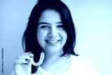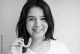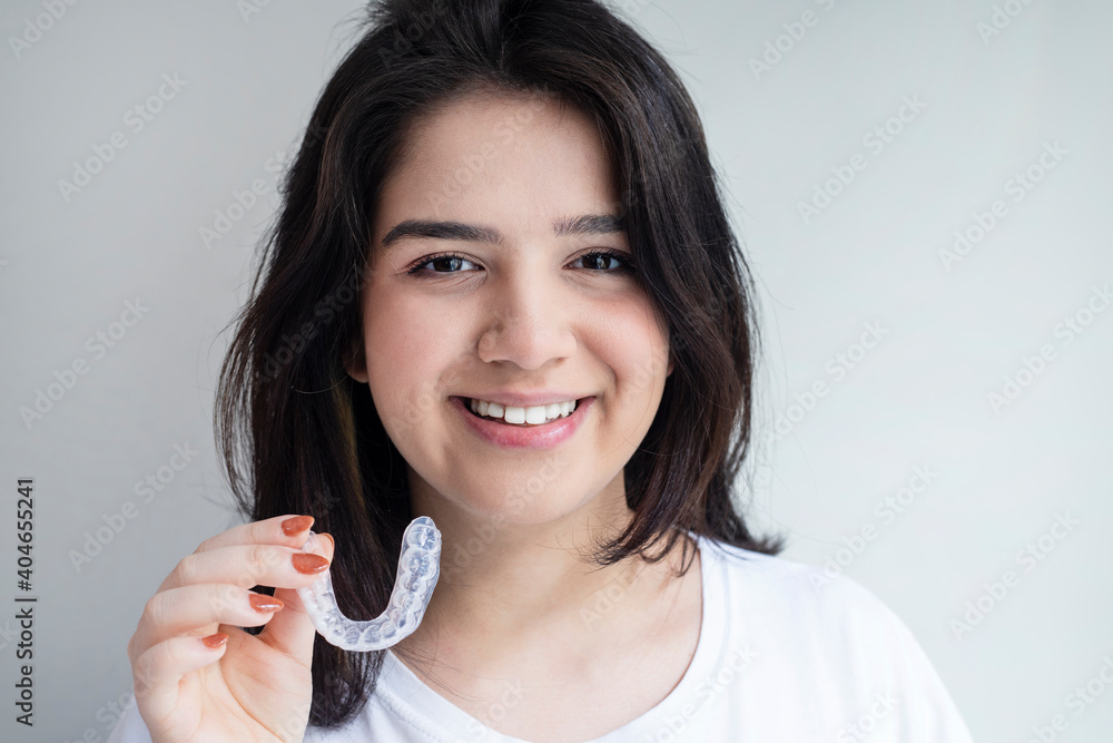 Close-up Of A Girl's Hand Putting Transparent Aligner In Teeth