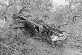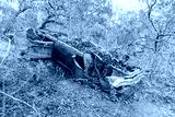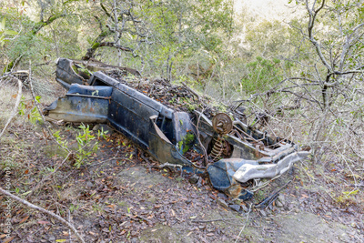 Old Car in the Woods of San Francisco Bay Area, California. Old crashed blue car surrounded by overgrown nature in Belmont, San Mateo County, California, USA