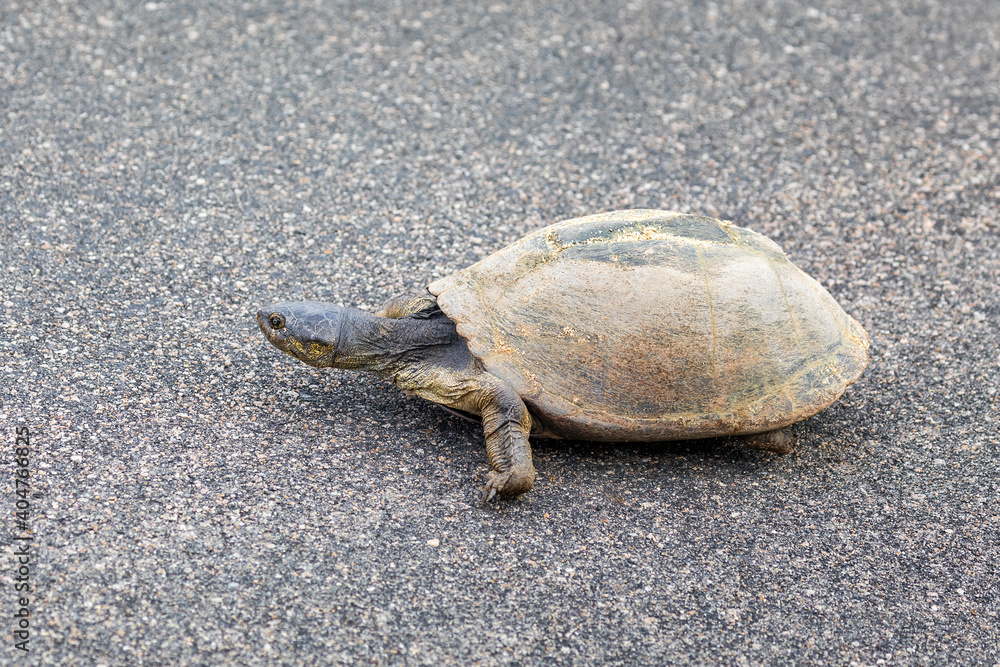 Pan hinged terrapin walks slowly across a road in Kruger National Park, South Africa.