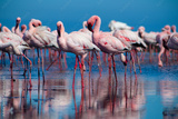 Wild african birds. Group birds of pink african flamingos walking around the blue lagoon