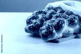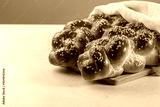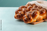 Homemade Challah bread with white cover, Jewish cuisine. Decorated with sesame and poppy seeds. Light green background.