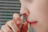 The child squirts a spray of medicine into the nose. The boy treats snot and runny nose, allergies.