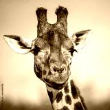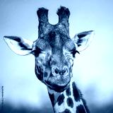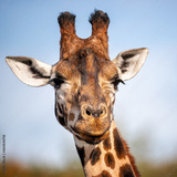 Rothschild giraffe, Giraffa camelopardalis rothschildi, against blue sky background.
