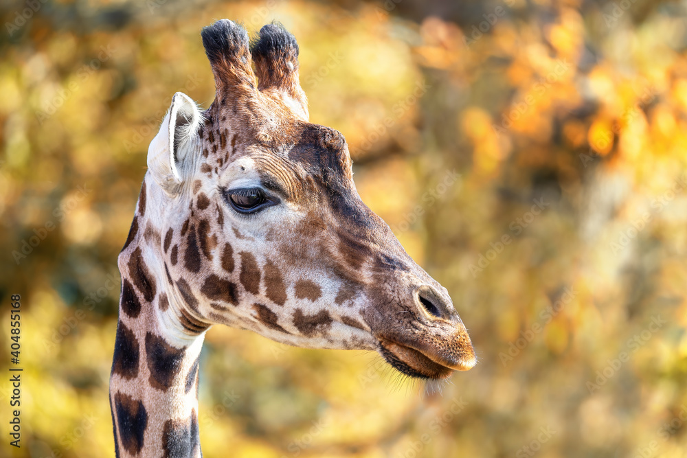 Rothschild giraffe, Giraffa camelopardalis rothschildi, against autumn foliage background.