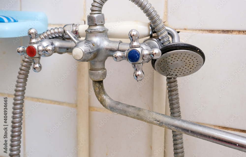 Dirty old faucet with limescale or lime scale on it, dirty calcified and rusty shower mixer tap and hose, moldy tiles on background. Mixer should be cleaned or replaced