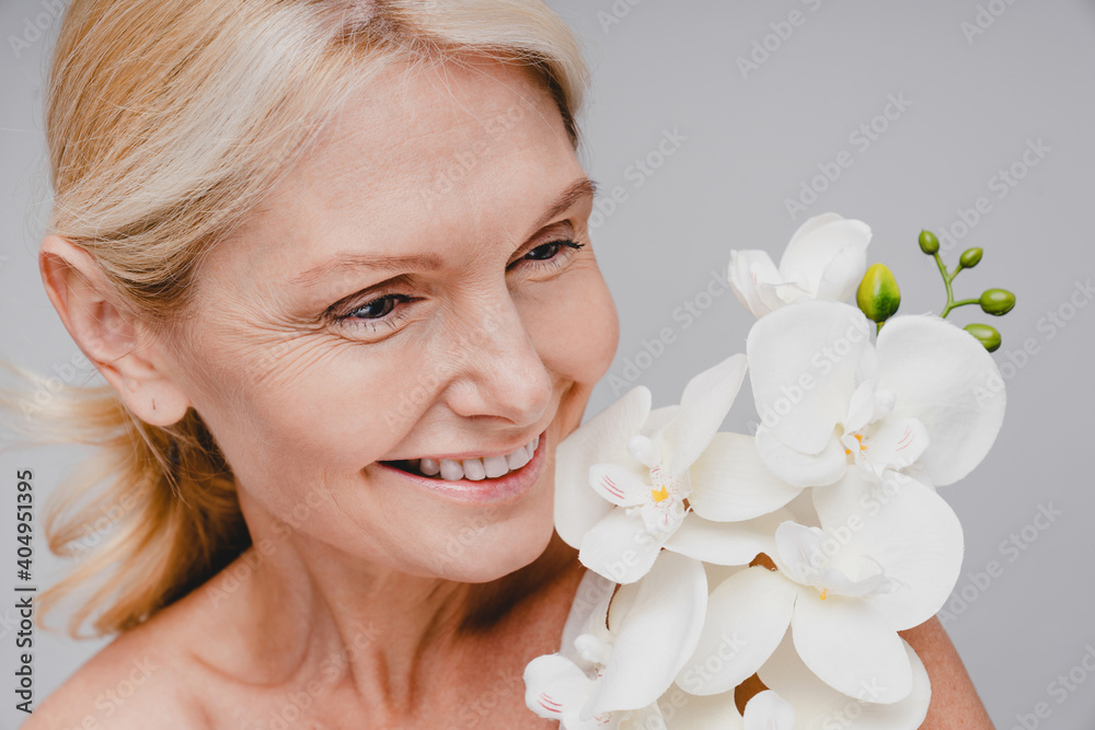 Close up portrait of middle-aged beautiful woman with orchid branch isolated over grey background