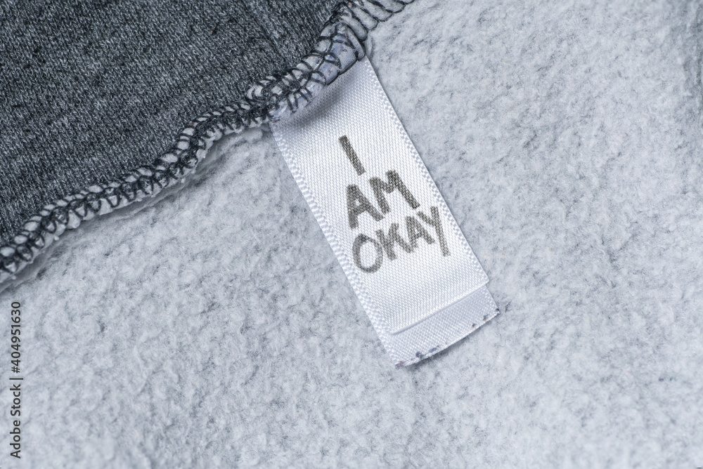 handwritten pullover label saying "I am okay" instead of the clothing size, close up macro shot of clothing tag, meme photo content.