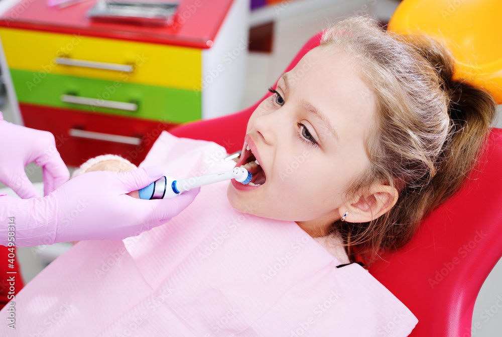 baby little cute girl without front milk teeth in red dental chair with electric automatic toothbrush in hands.