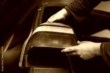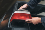 A mechanic installs taillights in a new car at a car service. A man holds a headlight in his hands.