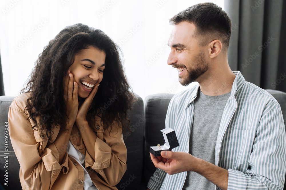 Will you marry me. Multiracial couple in love at home on the couch in living room. Caucasian man gives an engagement ring to his beloved african american woman, she gladly accepts it