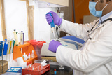 Indian medical scientist doctor wearing surgical face mask doing Chemical or drug research in clinical laboratory for covid virus vaccine, healthcare and medicine concept, covid vaccine, pandemic.