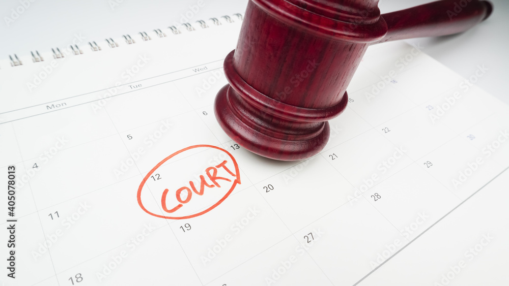 The words Court written and judge's gavel on the white calendar to remind you of an important trial date.