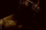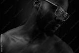 portrait of a handsome black man in red and blue light on dark background with glasses on his eyes, he has naked sports torso