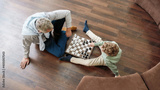 Board games. Top view of grandfather playing chess with little grandson, sittong on the wooden floor at home