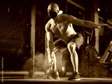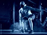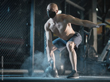 Young Man in Face Mask doing Exercise with dumbbell in Fitness Gym. Training during self-isolation COVID. Healthy Lifestyle and Sport Concepts. Functional training.