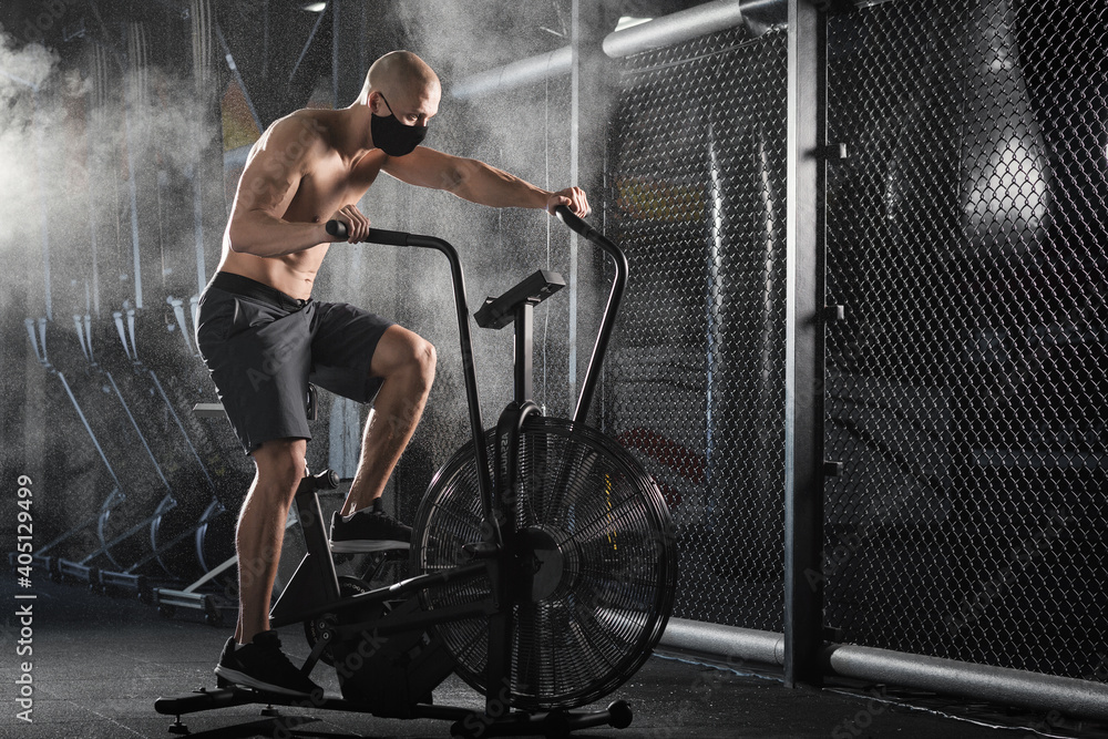 Young Man in Face Mask doing Exercise on Spin Bike in dark Fitness Gym. Guy Riding on Spinning Bike. Training during self-isolation COVID. Healthy Lifestyle and Sport Concepts. Functional training.