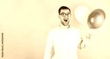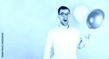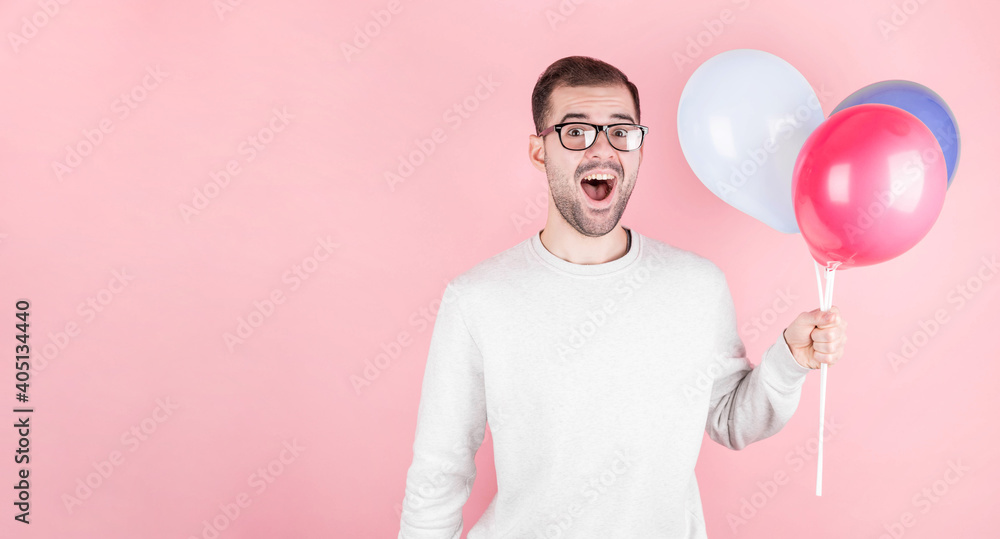 Young caucasian man holding balloons with surprised expression and celebrating a brithday isolated in a pink background