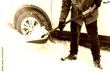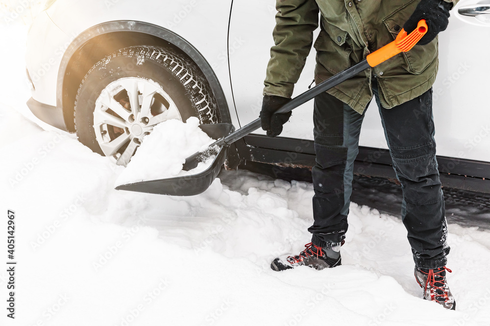 Man is shovelling snow near the car. Winter shoveling. Removing snow after blizzard