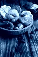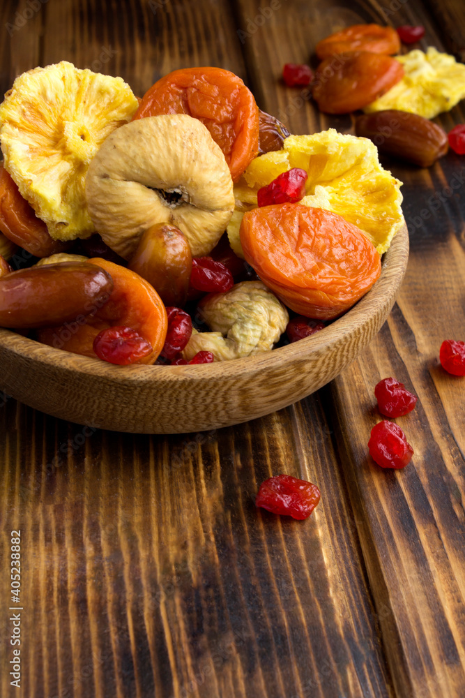 Different dried fruits in the brown bow on the wooden surface. Location vertical.
