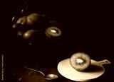 kiwi cut in the foreground on a white cutting board, in the background iron bowl with other kiwis, on a dark background