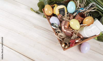 Easter Egg and plumbing tools, copper pipes and fittings. Holiday plumber. Top view. copy space.