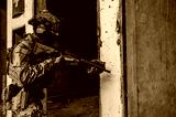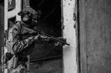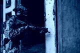 Special forces soldier doing tactical training in building clearing (CQB). He is wearing multicam uniform and assault rifle HK416.