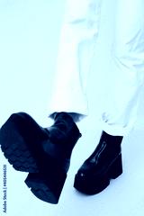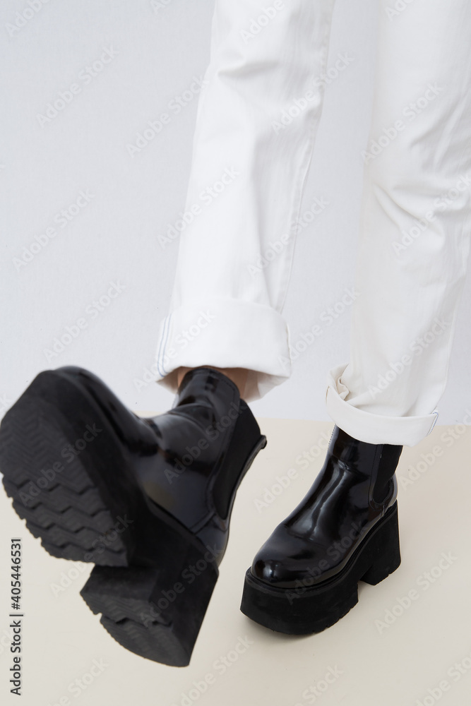 Details of trendy casual fall spring outfit. Woman wearing white jeans and stylish black platform boots. Everyday look. Street urban fashion concept. No face.