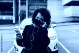 Urban afro hairstyle woman wearing face mask and using her phone for listening music in the street. Coronavirus Covid-19 new lifestyle.