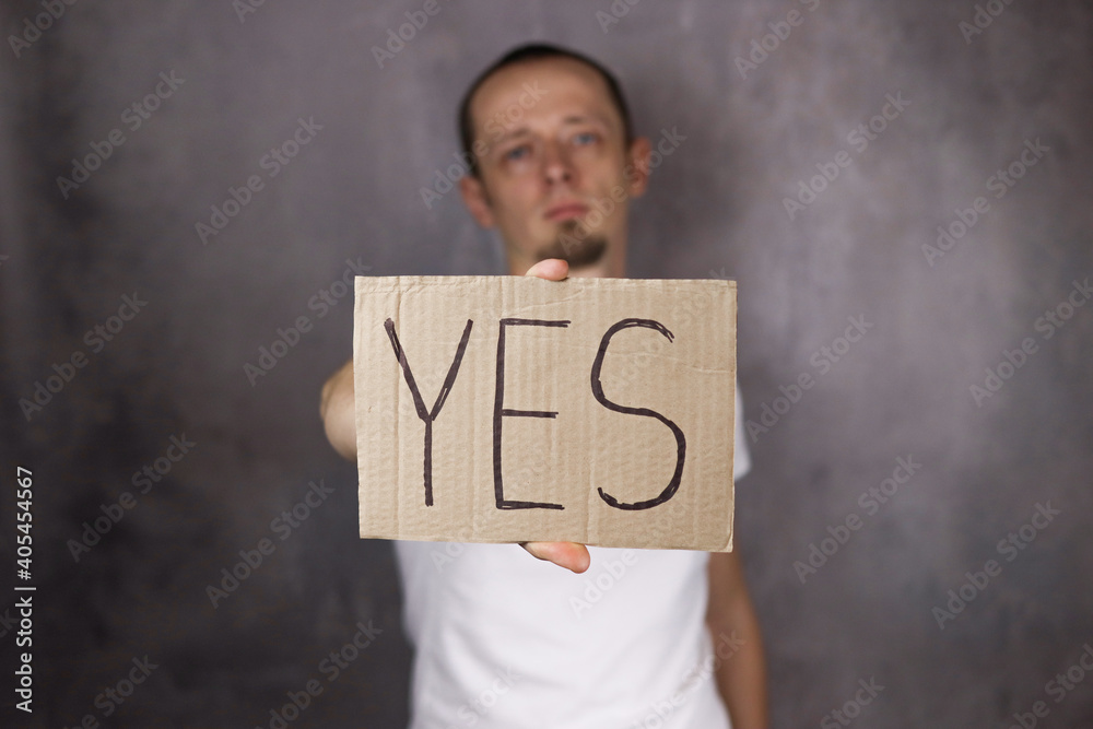 man holds a banner with the inscription Yes. Selective focus