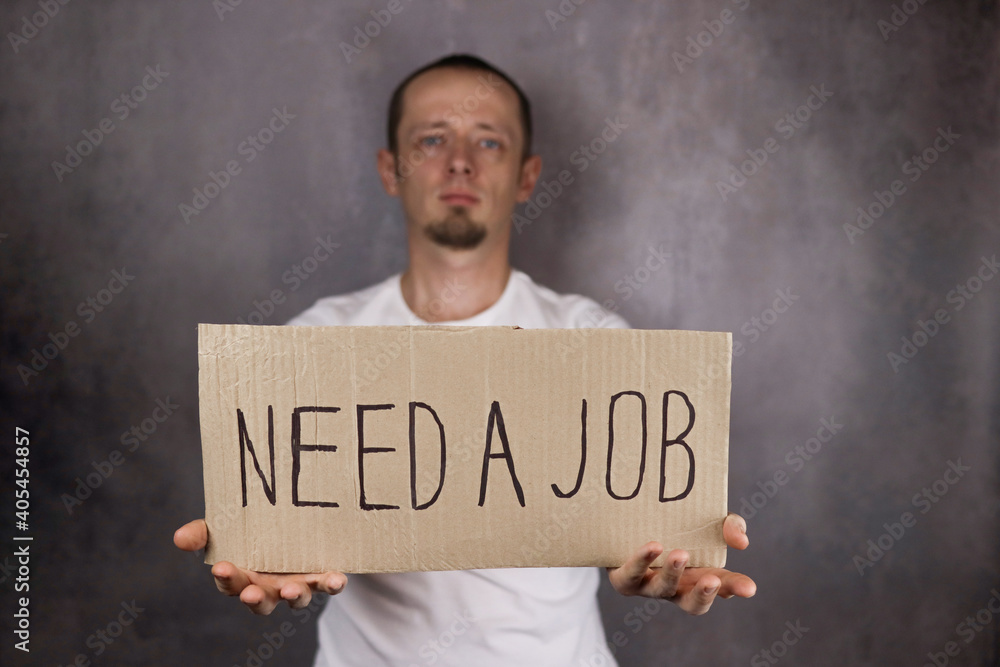 man holding a cardboard with an inscription need a job. concept of job search, a reduction. Selective focus