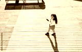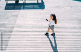 Top view of pensive hipster girl in electronic headphones walking at wooden pattern while listening audio book from smartphone application, youthful female user in earphones holding cellphone gadget