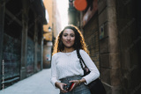 Smiling young woman with smartphone on street