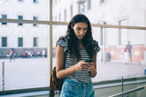 Pensive woman in casual trendy wear concentrated on sending text message via chatting app on mobile phone, 20s millennial hipster girl reading web page information on smartphone connected to 4G