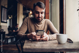 Happy young guy surfing internet on smartphone while resting in coffee shop