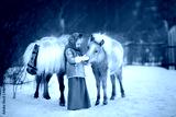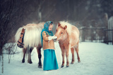 Russian style. Beautiful little girl in blue pavloposad shawl is feeding pony in winter in Russia. Image with selective focus and toning