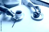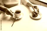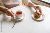 Woman enjoying having breakfast with cup of coffee and croissant sitting near window in cafe at morning.