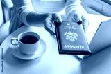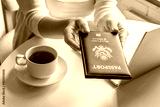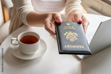 Woman tourist having breakfast with cup of coffee holds out american passport sitting near window at table in cafe in airport. Travel concept