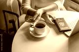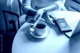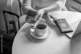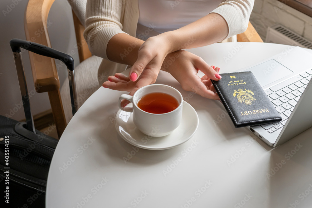 Woman tourist with suitcase having breakfast with cup of coffee putting american passport on the table sitting near window in cafe in airport using laptop. Travel concept
