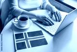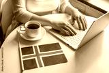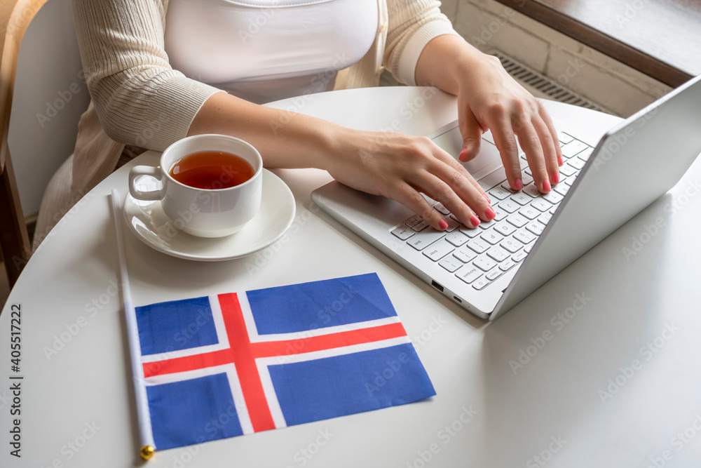 Lonely woman freelancer with flag of Iceland enjoying having breakfast with cup of coffee working on laptop sitting near window in cafe at morning.