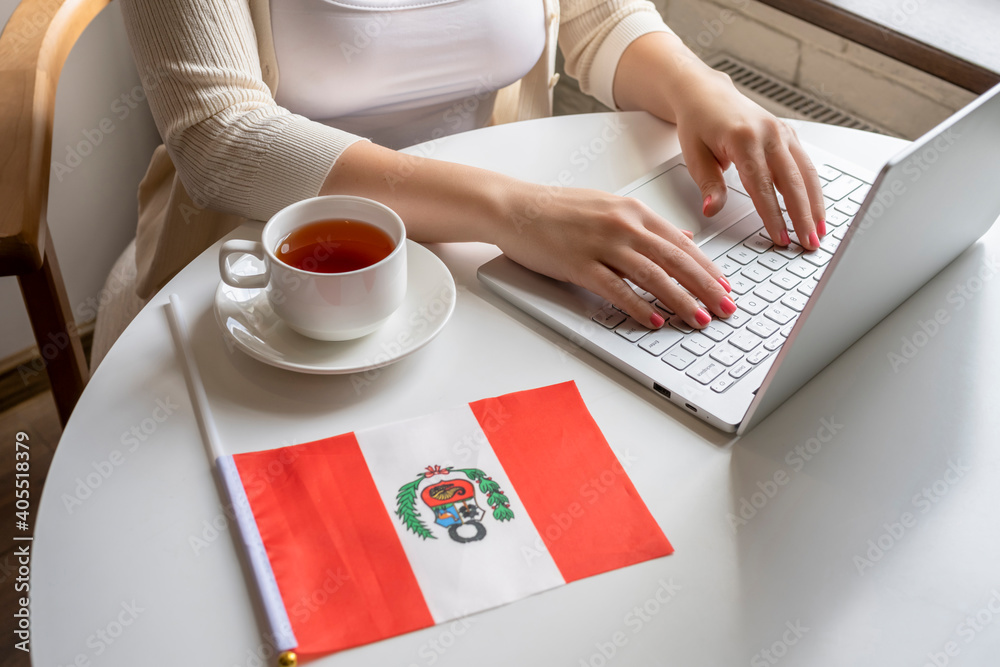 Lonely woman freelancer with flag of Peru enjoying having breakfast with cup of coffee working on laptop sitting near window in cafe at morning.