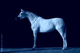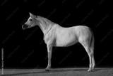 Body portrait of a beautiful white arabian horse on black background isolated, profile side view, exterior