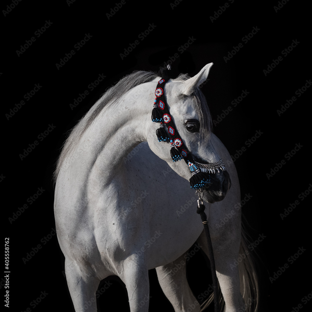Portrait of a beautiful white arabian horse with show halter on black background isolated, head closeup