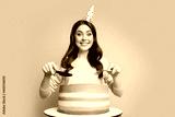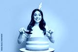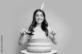 Portrait of attractive person hand hold fork knife cutting colorful cake party headwear isolated on pastel pink background