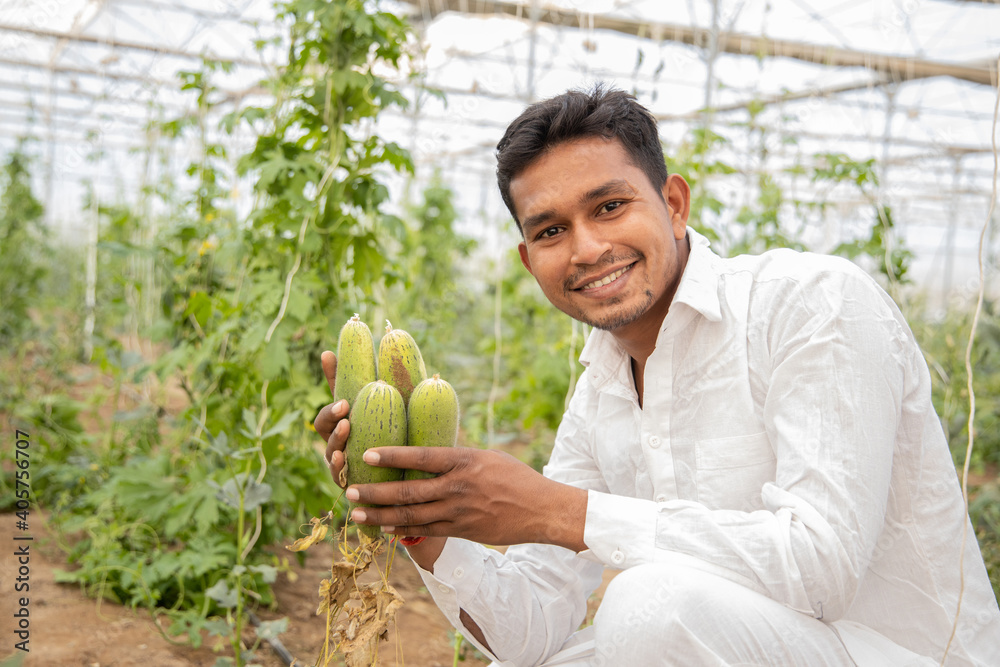 Happy indian farmer harvest cucumbers from his poly house or greenhouse, Fresh organic vegetables, modern farming, agriculture concept,