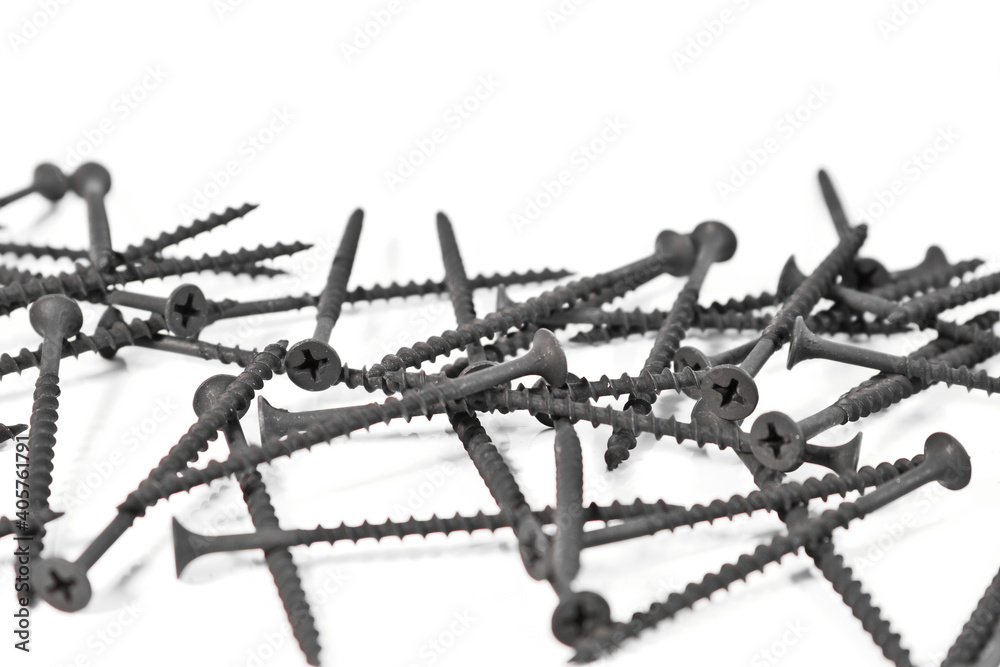 A bunch of self-tapping screws for wood surfaces on a white background. Metal fasteners.