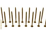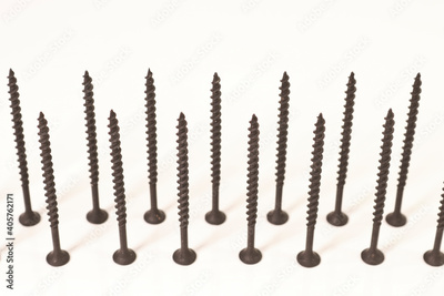 Self-tapping screws for wood surfaces, standing on hats, on a light background. Components for construction and repair. Metal fasteners.