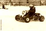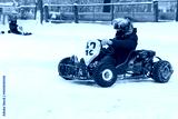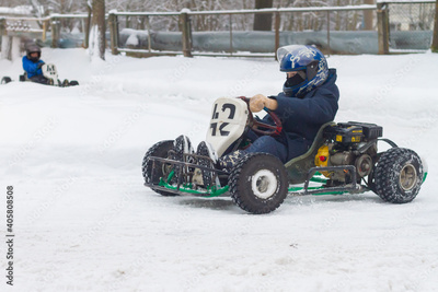 Children's karting competitions in winter. Teenagers drive through the snow in cars for children.